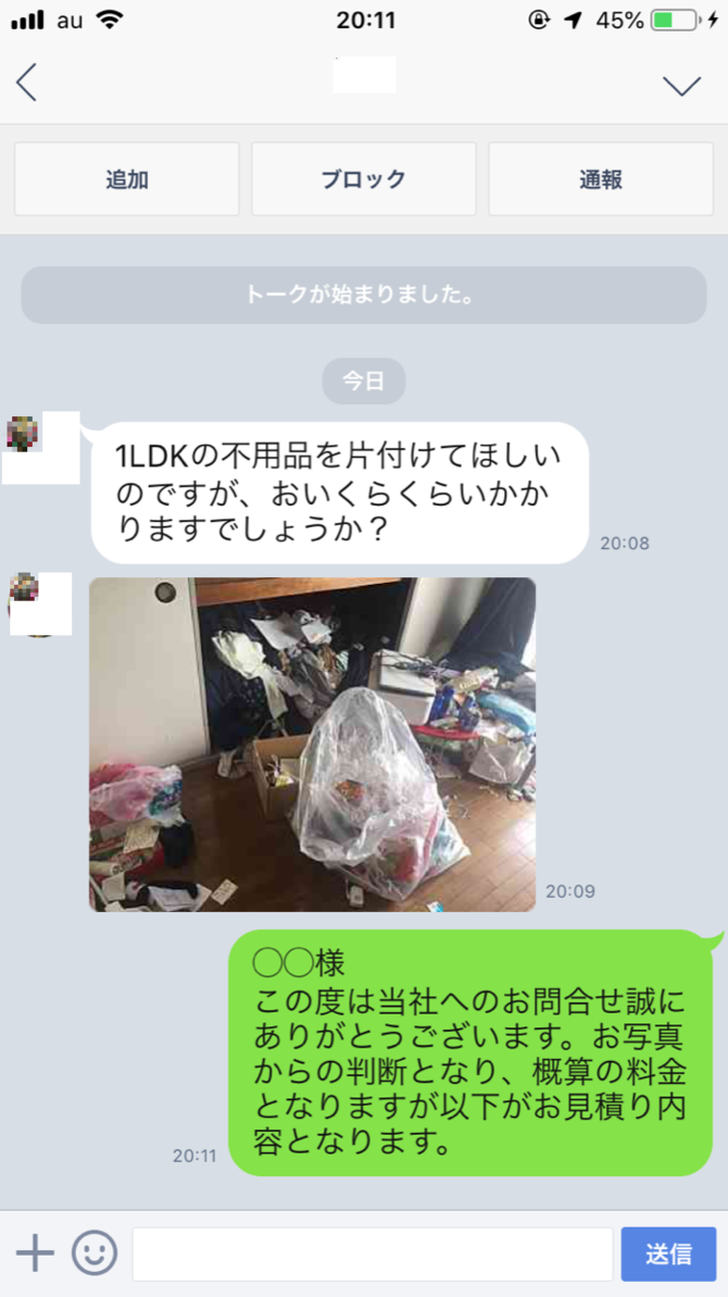 ご依頼内容やご相談内容をメッセージください。また、撮影頂いた画像を当社まで送信ください。写真がない場合でも概算の料金をご提示することは可能です。